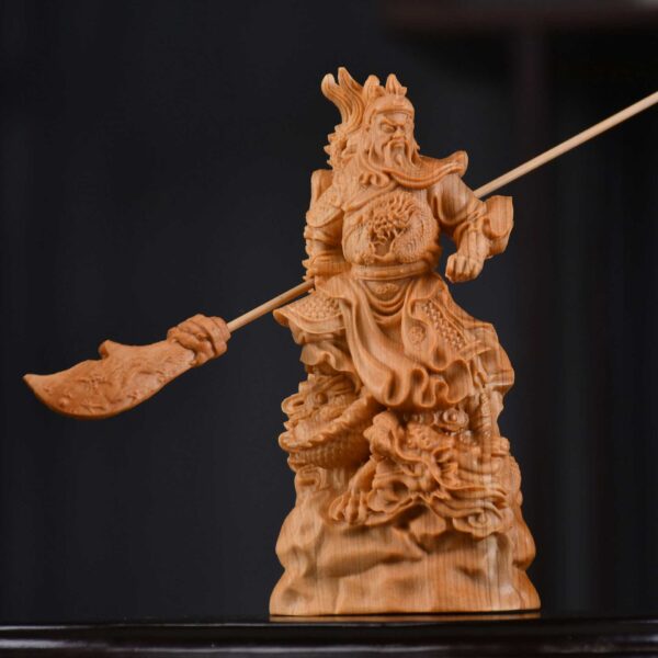 This exquisitely carved statue of Guan Yu holding a big sword, made of Taihang Cliff Cypress wood, showcases rich Chinese elements. Depicting Guan Yu in a majestic pose with a determined gaze, wielding his legendary Blade of the Green Dragon, it embodies the spirit of loyalty and bravery. The natural grains of Taihang Cliff Cypress wood add a touch of mystery and artistic value to this piece, making it a perfect choice for home decor and collection.