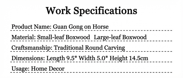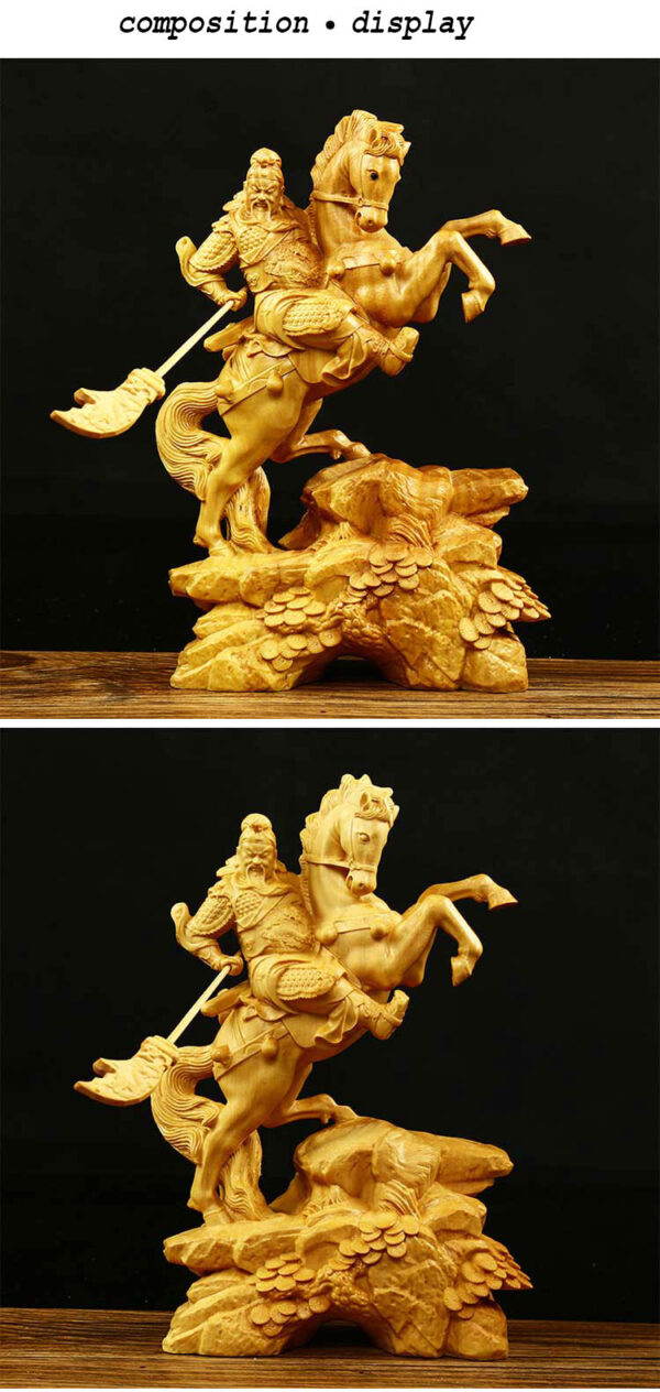 This ornament meticulously crafted from precious boxwood, features a vivid depiction of Guan Yu and his steed, embodying the spiritual connotations of “loyalty, trustworthiness, righteousness, and bravery.” Placed in a home or office, it not only showcases the owner’s taste and elegance but also brings good fortune, safeguards the tranquility of the household, and aids in achieving career success and financial prosperity.